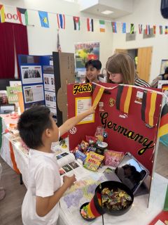 The World’s Fair culminated in a vibrant, community-wide event where students proudly presented their work to peers, families, and faculty. The MPR was transformed into interactive exhibits, filled with colorful displays, engaging websites, and enthusiastic student presenters eager to share what they had learned. Many students even dressed up to represent their countries, adding another layer of excitement and cultural immersion to the experience. A highlight of the event was the opportunity for students to prepare and share food from their countries, which was a huge hit with everyone in attendance and created a memorable, hands-on cultural experience.